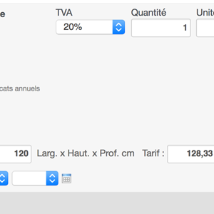 - Dans les devis et factures : un nouveau champ "Tarif calculé", pour désigner les dimensions de l'article et calculer son prix de vente