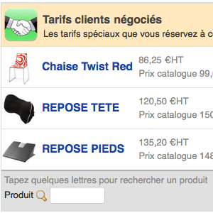 - Recherchez le nom du produit ou sélectionnez une catégorie produit, dans le bloc "tarifs client négociés"