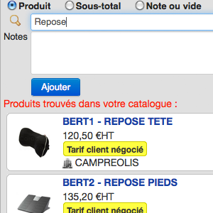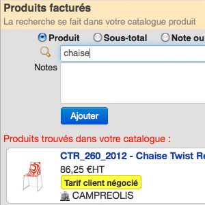 Lors de la création d'un devis ou d'une facture pour un client ayant négocié un tarif, procédez comme habituellement. Appelez votre article en indiquant les premières lettres de son nom, au niveau de la loupe.