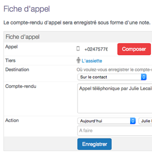 Pour lancer un appel, cliquez sur un numéro de téléphone. Une nouvelle page s'affiche : c'est la fiche d'appel.