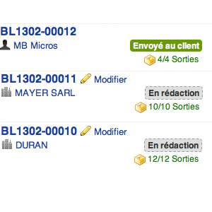 Retrouvez en mode liste des bons de livraison ou d'intervention, mais aussi des factures et bons de commande, l'information sur l'état du mouvement de stock associé à votre document.
