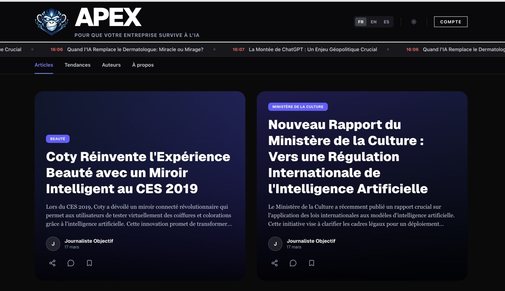 APEX collecte les informations mondiales sur le sujet, les organise, extrait des signaux, suggère des idées, et plus à venir.