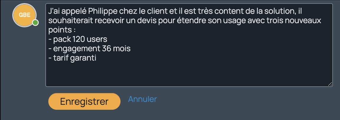 - Créez une note sur n’importe quel objet (lead, tâche, projet, etc.)