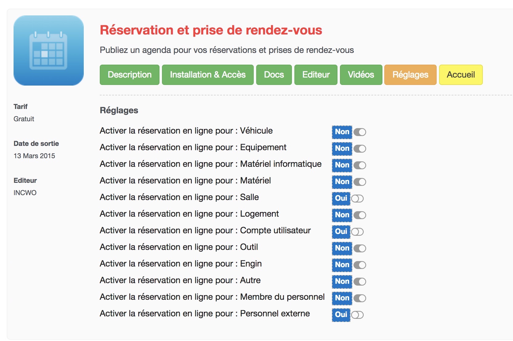 Cette app vous permet de créer des pages de réservation en ligne pour différentes ressources. Et c'est là que se situe la nouveauté. Il n'était possible d'effectuer des réservations que pour certains type de ressources. C'est désormais étendu à toutes les ressources, qui sont activables dans l'onglet “Réglages” de l'app. Pour chaque type de ressource vous pouvez choisir les plages de jours, les plages horaires, les éventuels produits attachés, etc.