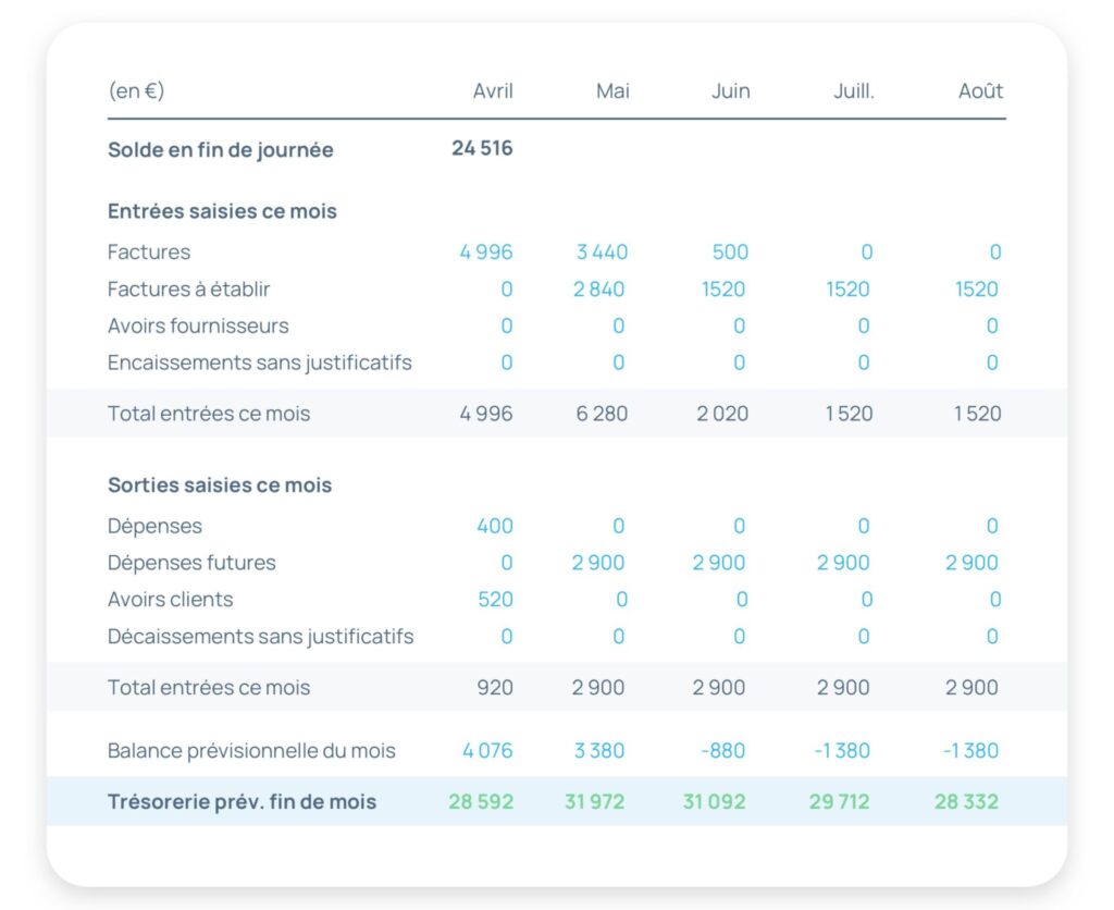 - Anticiper les flux financiers. Une trésorerie prévisionnelle précise permet de visualiser ses entrées et sorties d’argent sur plusieurs mois, voire années. Vous évitez ainsi les découverts bancaires et optimisez votre besoin en fonds de roulement (BFR).