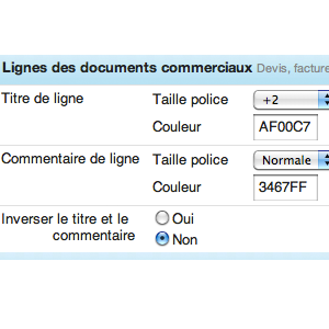 This new document appearance settings area, called"Commercial document lines", lets you choose the display format for"title" and"comments"(notes) fields, by selecting for each :