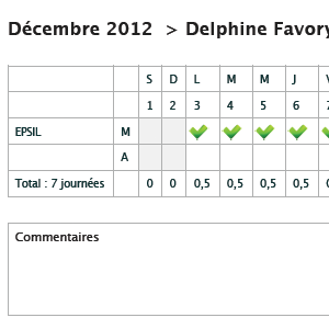 Timesheets whose status is validated have a "PDF" link for printing a PDF file containing, for each case, a page containing :