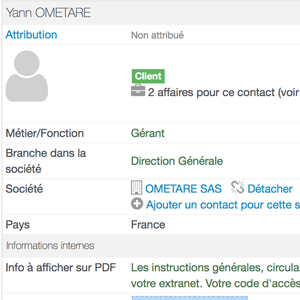 Installing the app adds a new information entry zone called "Info to display on PDFs" on contact and company files.