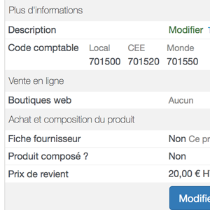 Activation of the app adds 2 additional accounting code entry boxes to the "accounting code" fields in product and financial category sheets, to define the accounting code to be applied to the following territories: