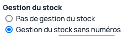 - En second lieu, le type de gestion de stock doit être : “Gestion de stock sans numéros”, si vous gérez vous même les stocks, dans vos propres entrepôts. La notion “Pas de gestion de stocks”, correspond à des cas où vous êtes revendeur, négociant et où le fournisseur gère directement les stocks et assure les livraisons depuis ses propres entrepôts.