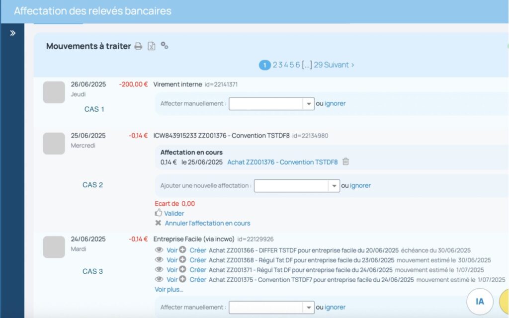 Pour savoir comment réaliser les traitements relatifs à l’affectation bancaire, et ainsi rapprocher les lignes de relevés, reportez-vous au mode d’emploi suivant : “Comment affecter ses relevés bancaires ?”