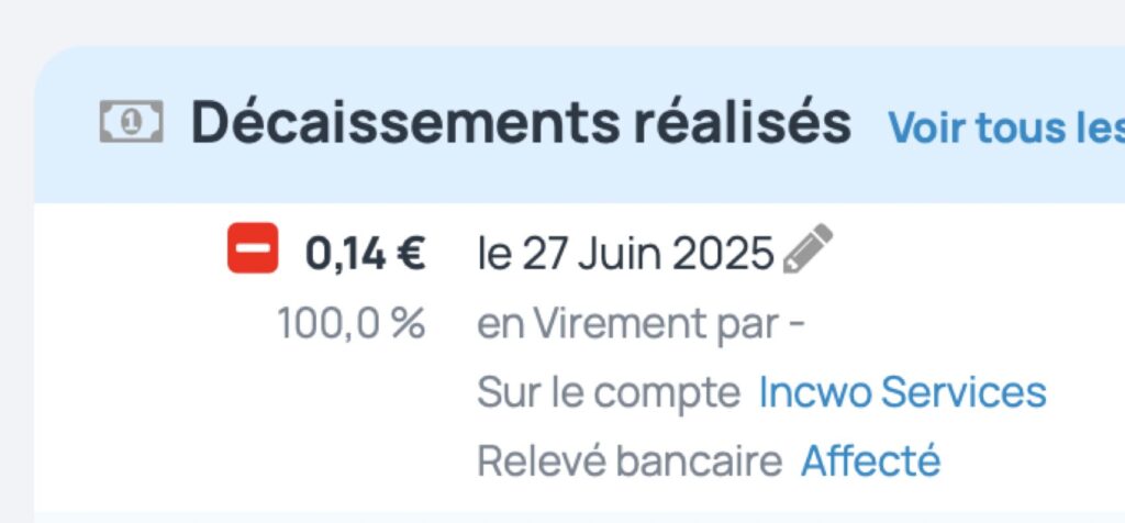 Ainsi, la réussite du paiement permet automatiquement l’enregistrement de la dépense sur la fiche d’achat, dans la section “Décaissements réalisés”.