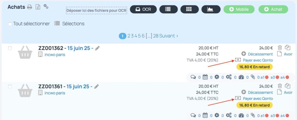 - Depuis la liste des achats fournisseurs : vous payez chaque dépense individuellement, en cliquant directement sur la ligne concernée.
